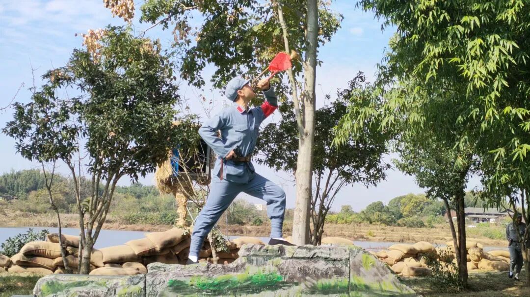 演出中,由皂市镇民兵凭借过硬的军事素养和饱满的精神状态,在“阵地”上完美复现了红军战士的英勇形象。在表现“围歼敌军”的场景中,民兵们以娴熟的战术队形展开穿插、包抄与突击,与逼真的战场还原,将当年红军将士一往无前的英雄气概展现得淋漓尽致。
